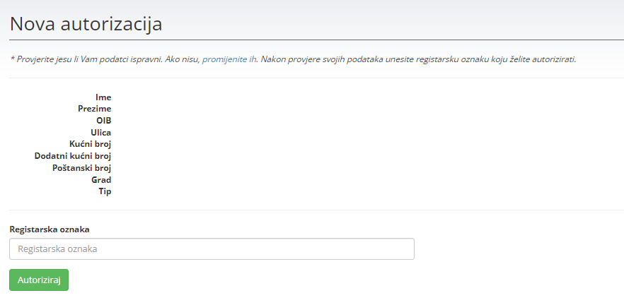 Za novu autorizaciju potrebno je upisati registarsku oznaku vozila.