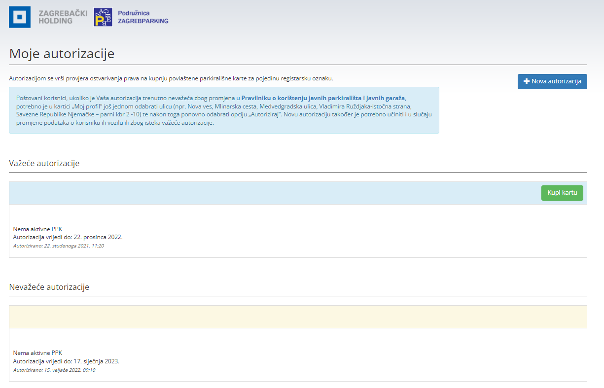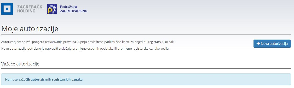 u kartici „Moje autorizacije“ obaviti autorizaciju na temelju koje ostvarujete pravo na kupnju povlaštene parkirališne karte za pojedinu registarsku oznaku.