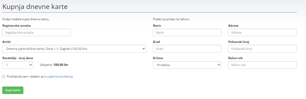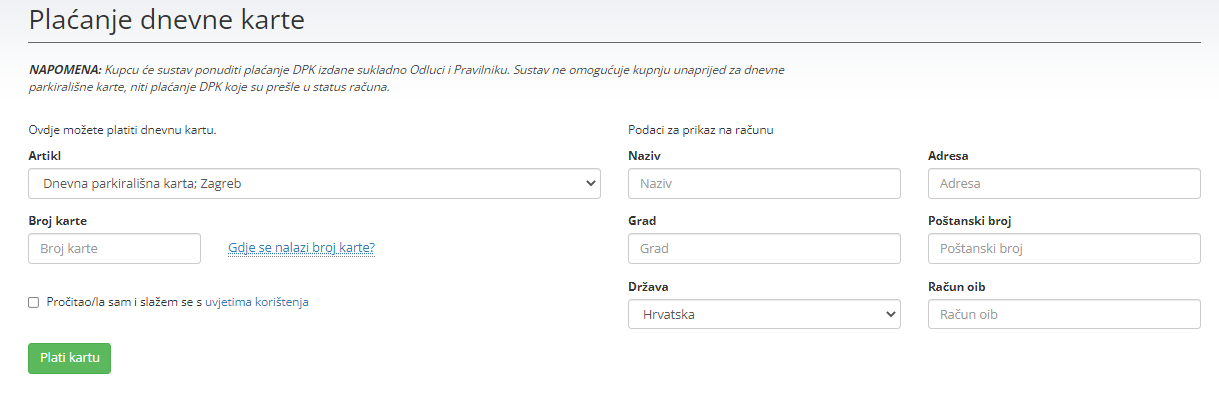 Za kupnju dnevne parkirališne karte potrebno je upisati registarsku oznaku za koju kupujete DPK i odabrati artikl. Kupnju DPK nije moguće obaviti unaprijed te ista vrijedi 24 sata od trenutka kupnje. U podacima za prikaz na računu mogu se popuniti podatci od firme ukoliko imate potrebe za R1 račun.