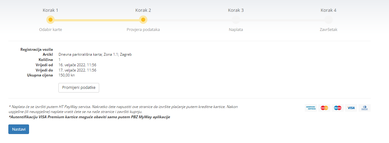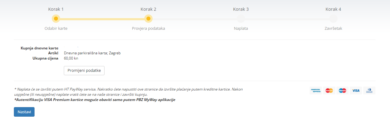 Prije nastavka plaćanja provjerite da li ste upisali ispravan broj dnevne karte. Ako je sve u redu, kliknite „Nastavi“, a ako je potrebno napraviti promjenu kliknite „Promijeni podatke“.