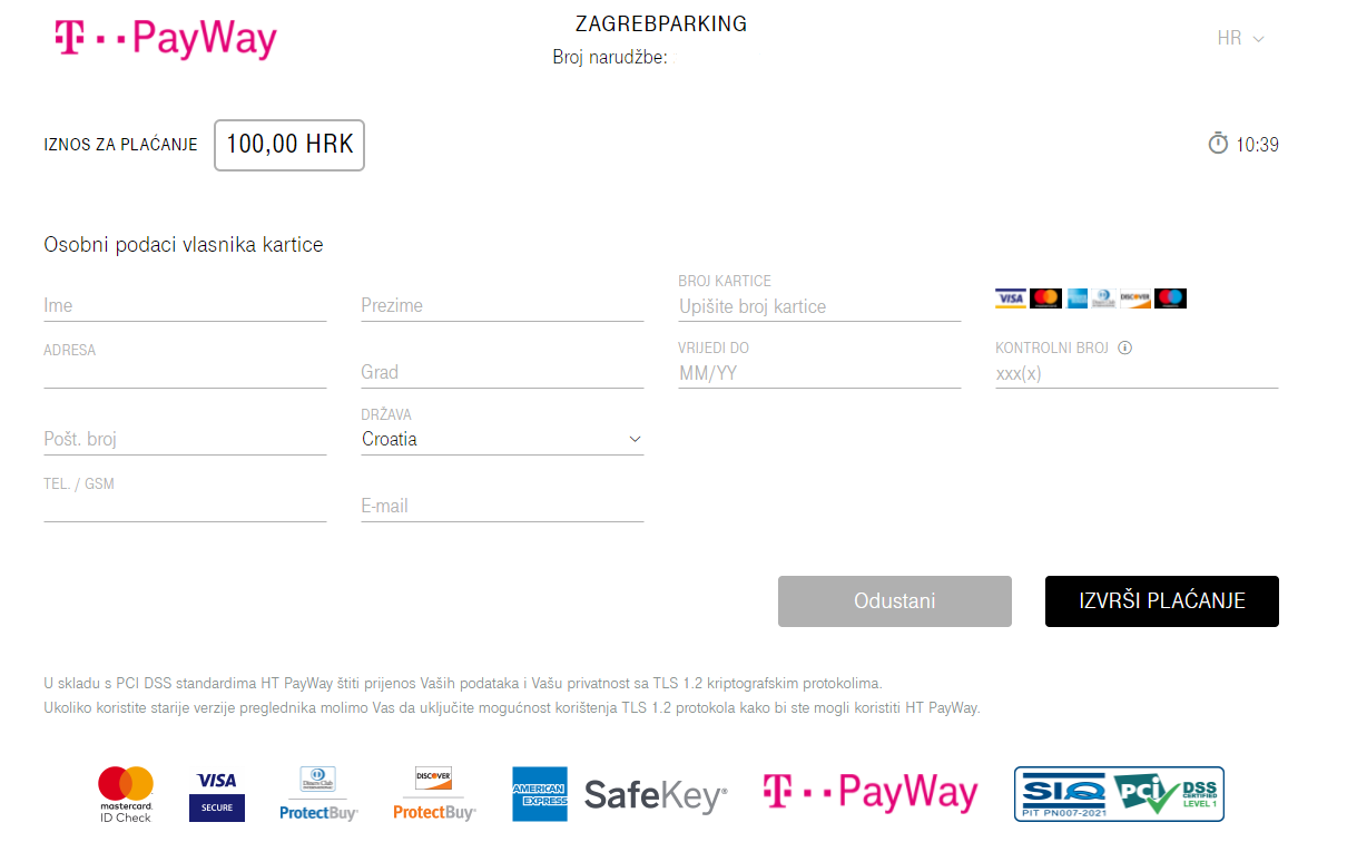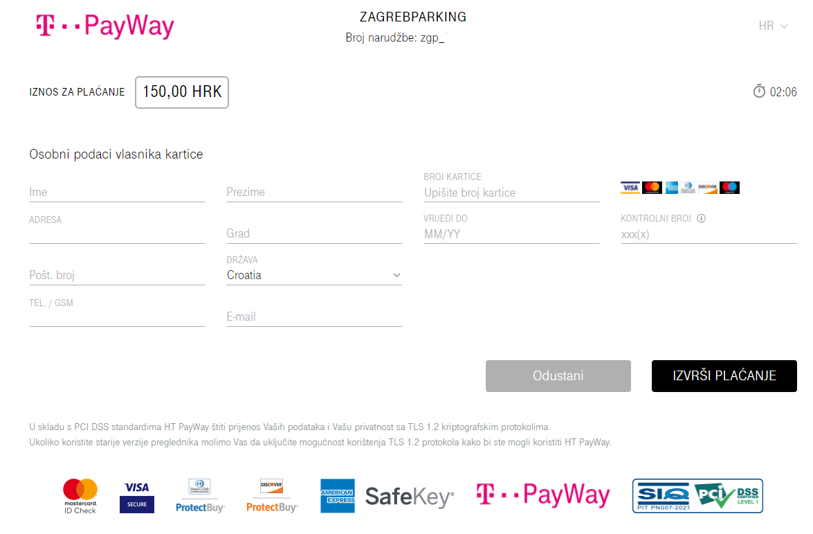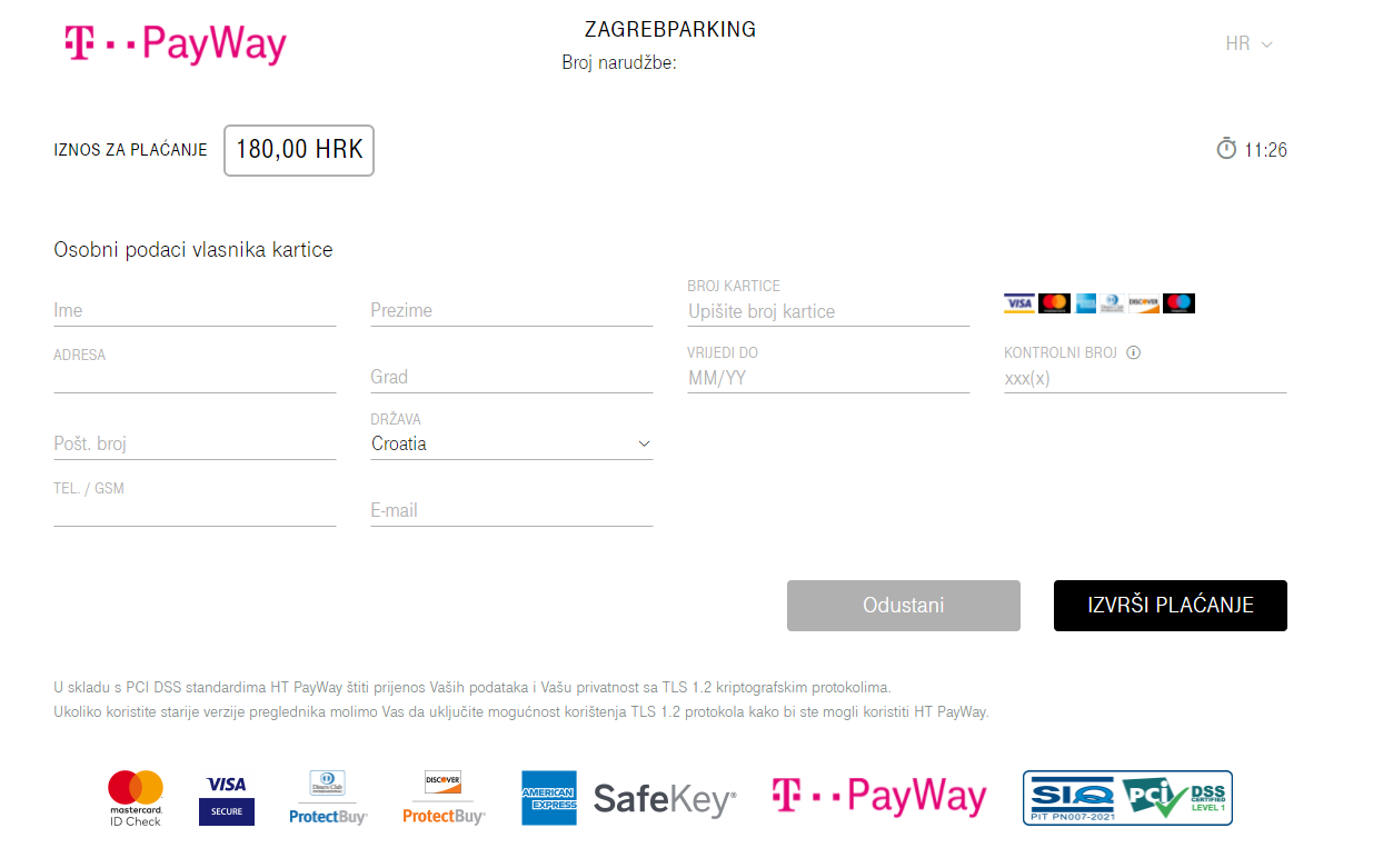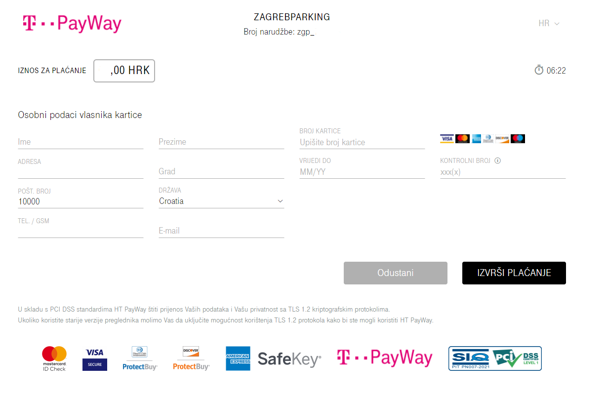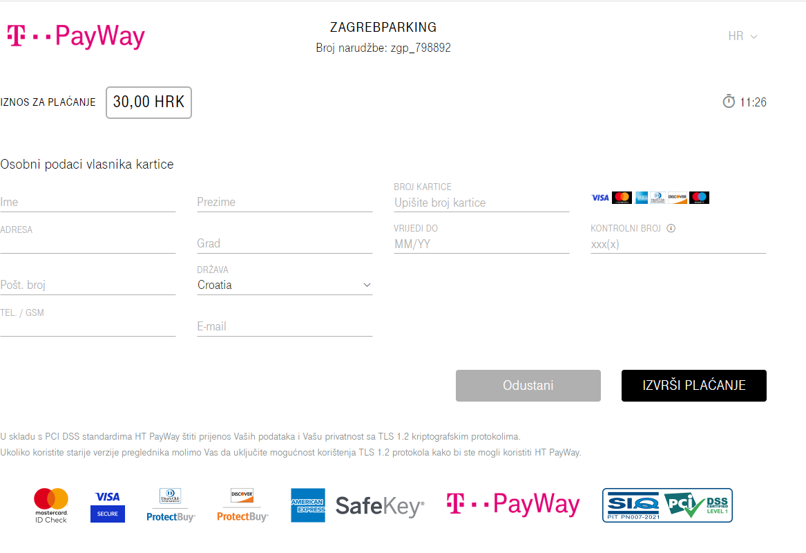 U sustavu za kupnju (PayWay) ispunite i provjerite točnost podataka za plaćanje, te kupite parkirališnu kartu.