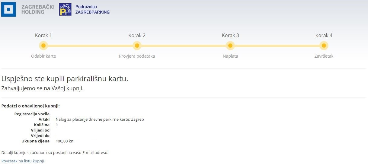 Nakon što ste platili dnevnu parkirališnu kartu putem sustava za plaćanje, na e-mail adresu dobit ćete potvrdu o plaćenoj parkirališnoj karti.