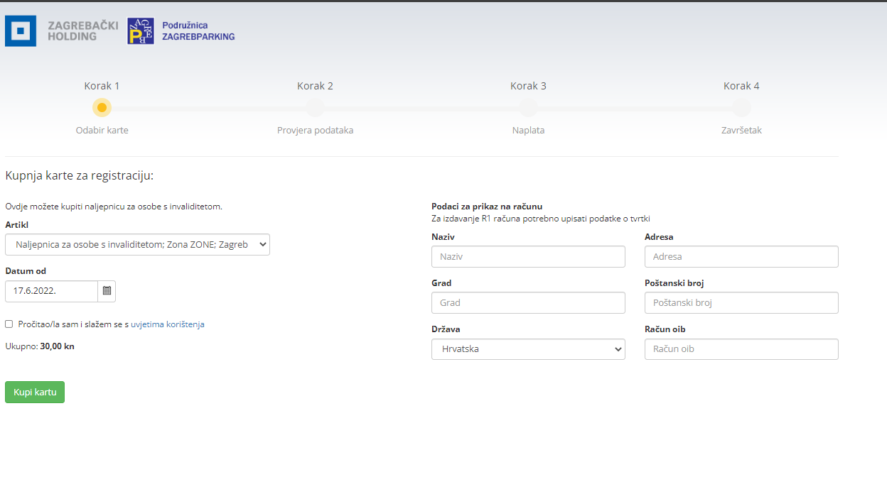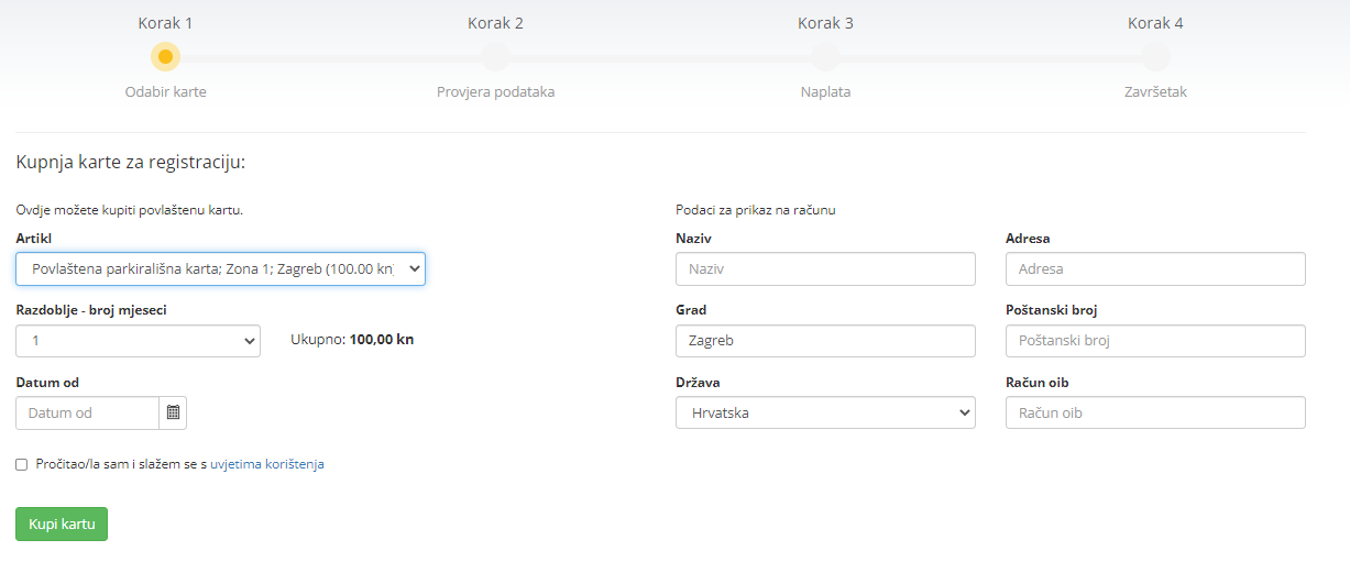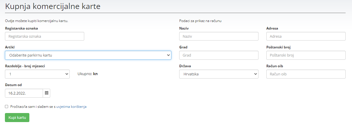 Za kupnju komercijalne parkirališne karte potrebno je upisati registarsku oznaku za koju kupujete KPK, odabrati artikl, vremensko razdoblje te datum od kada želite kupiti KPK. U podacima za prikaz na računu mogu se popuniti podatci od firme ukoliko imate potrebe za R1 račun