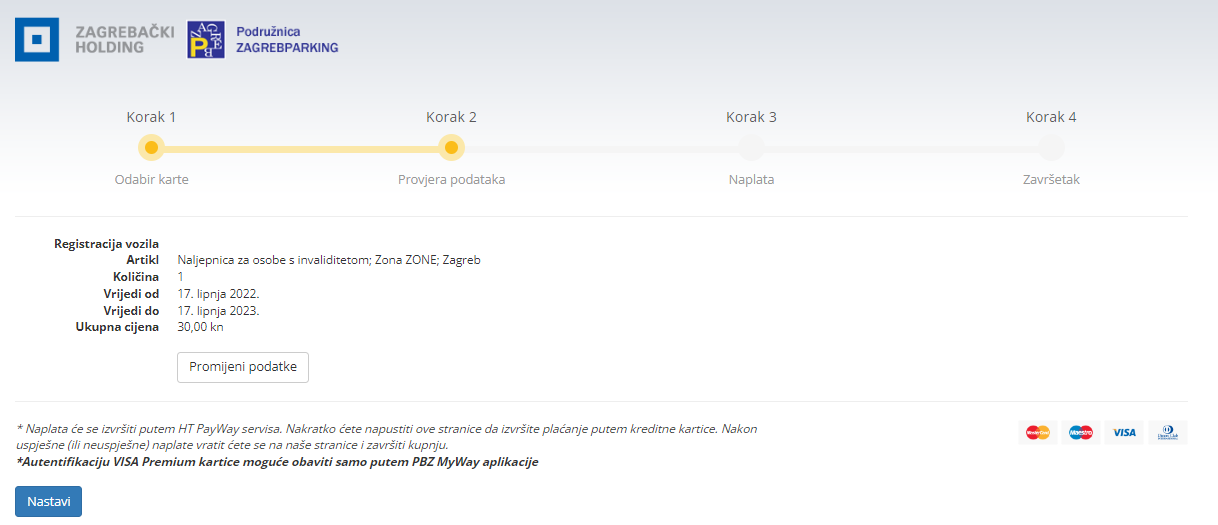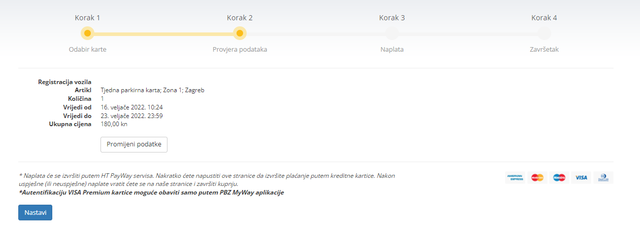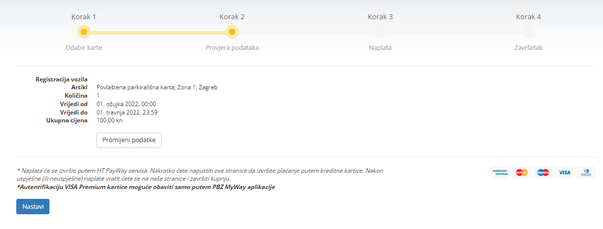 Prije nastavka kupnje provjerite podatake. Ako je sve u redu, kliknite „Nastavi“, a ako je potrebno promjeniti neki podatak kliknite „Promijeni podatake“.