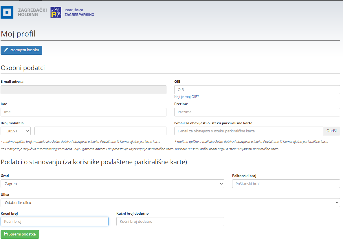 u kartici „Moj profil“ unijeti podatke na temelju kojih ostvarujete pravo na povlaštene parkirališne karte,