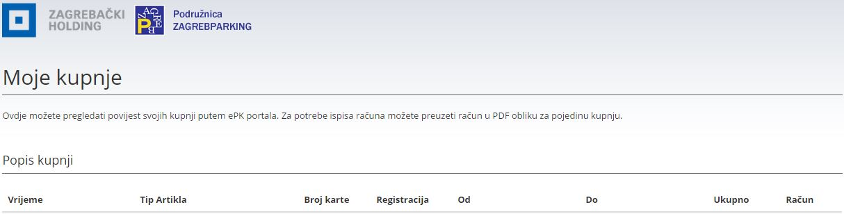 Ovdje možete pregledati povijest svojih kupnji putem ePK portala. Za potrebe ispisa računa možete preuzeti račun u PDF obliku za pojedinu kupnju.