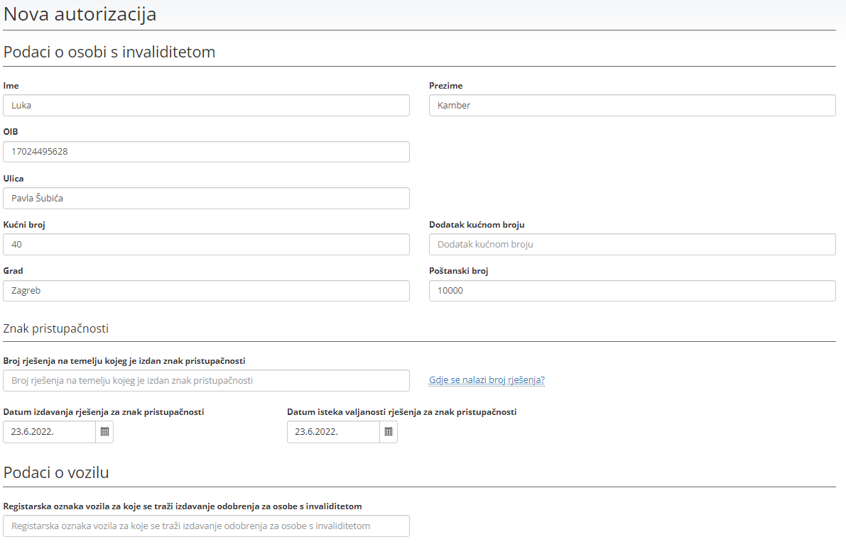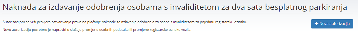 U kartici „Nova autorizacija“ da bi registrirani korisnik prošao postupak autorizacije potrebno je upisati podatke o osobi s invaliditetom, broj rješenja na temelju kojeg je izdana Europska parkirališna karta za osobe s invaliditetom, registarsku oznaku vozila te izdavatelja i broj osobne iskaznice.