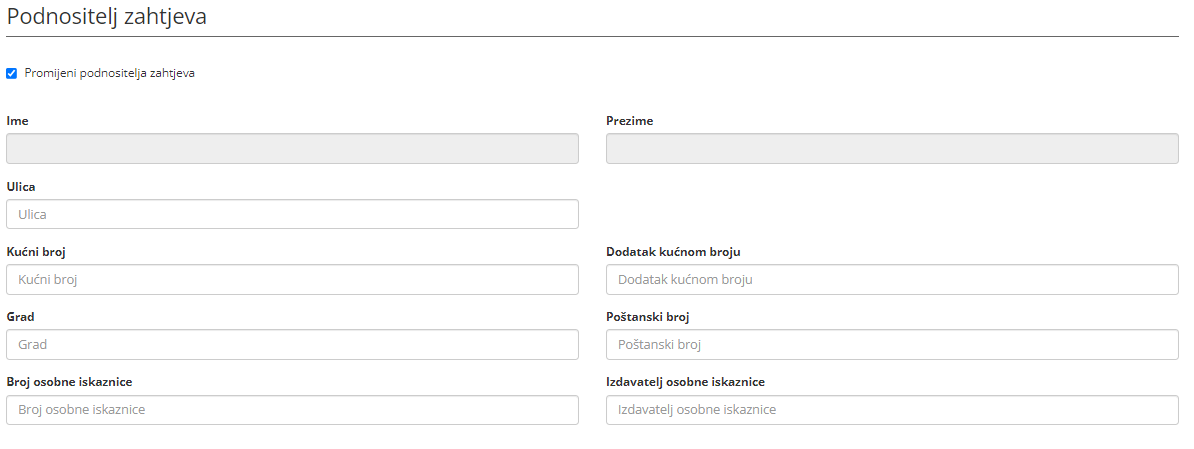 Ukoliko podnositelj zahtjeva nije osoba s invaliditetom onda je potrebno kvačicom na „Promjeni podnositelja zahtjeva“ aktivirati dodatni unos podataka o podnositelju zahtjeva.