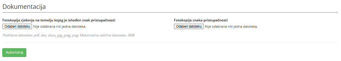 Nakon unosa podataka o podnositelju zahtjeva potrebno je poslati dokumentaciju na temelju koje će se odobriti autorizacija: