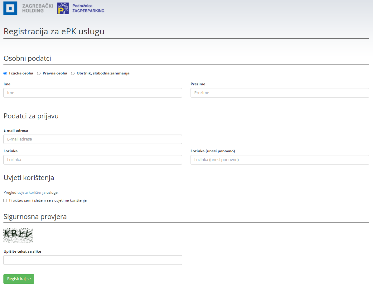 Za kreiranje korisničkog računa na ePK Portalu potrebno je upisati tražene podatke.