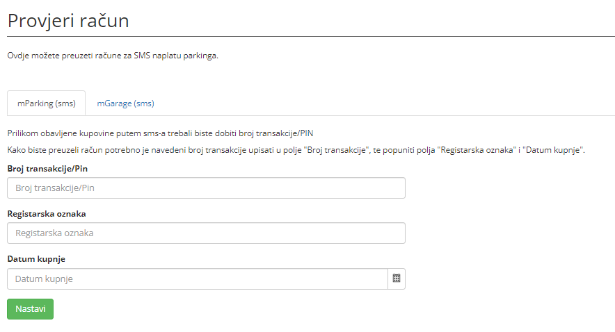 U kartici SMS računi moguće je preuzeti račune za SMS naplatu parkinga. Sučelje nudi provjeru za SMS parking na javnim parkiralištima ili u javnim garažama.